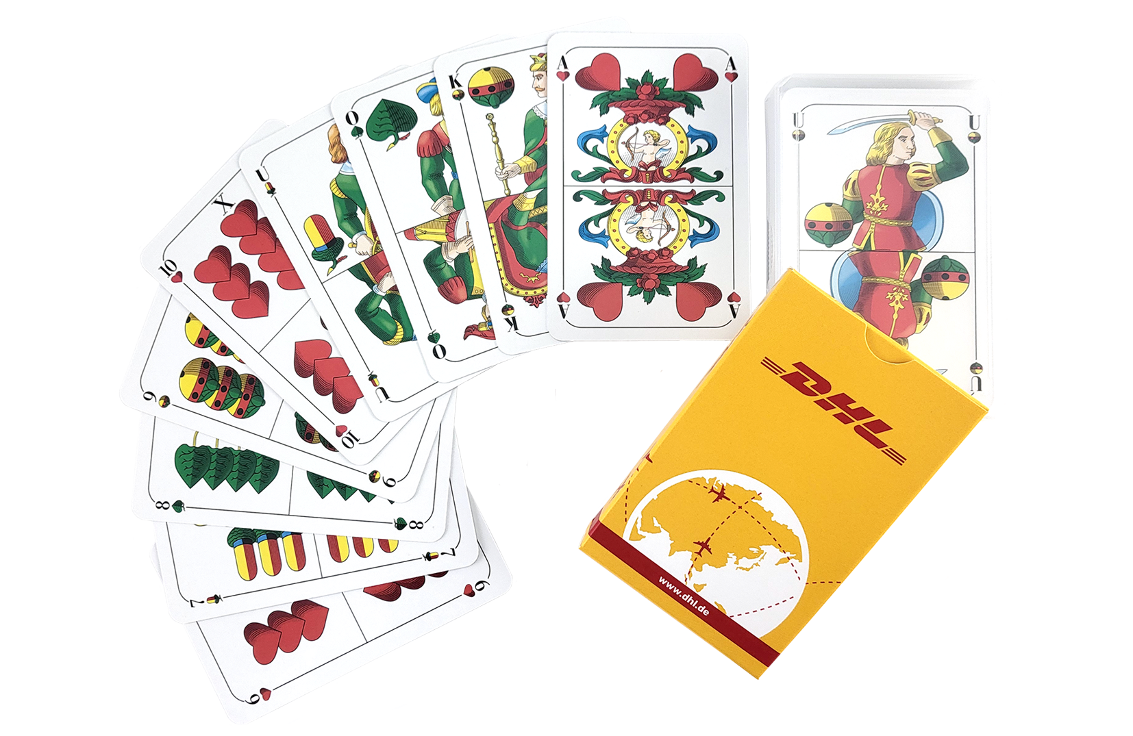 Spielseite mit deutschem Bild (Eichel, Laub, Herz und Schellen)