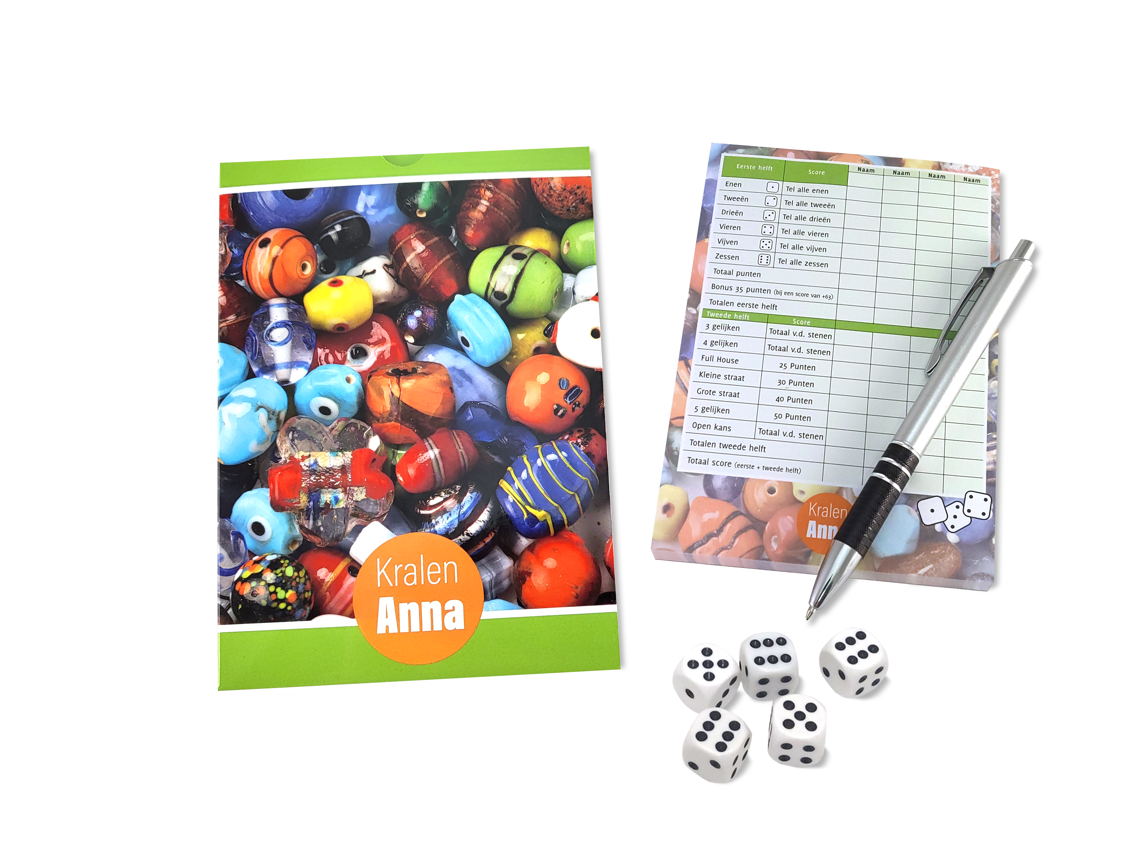 Om Yahtzee en soortgelijke populaire spellen mee te spelen. De promotionele doos en het scoreblok worden geheel naar wens in Full Colour bedrukt. De standaard pen is onbedrukt, maar wij kunnen, zonder kosten een pen, die bij ons door u wordt aangeleverd, bijvoegen.